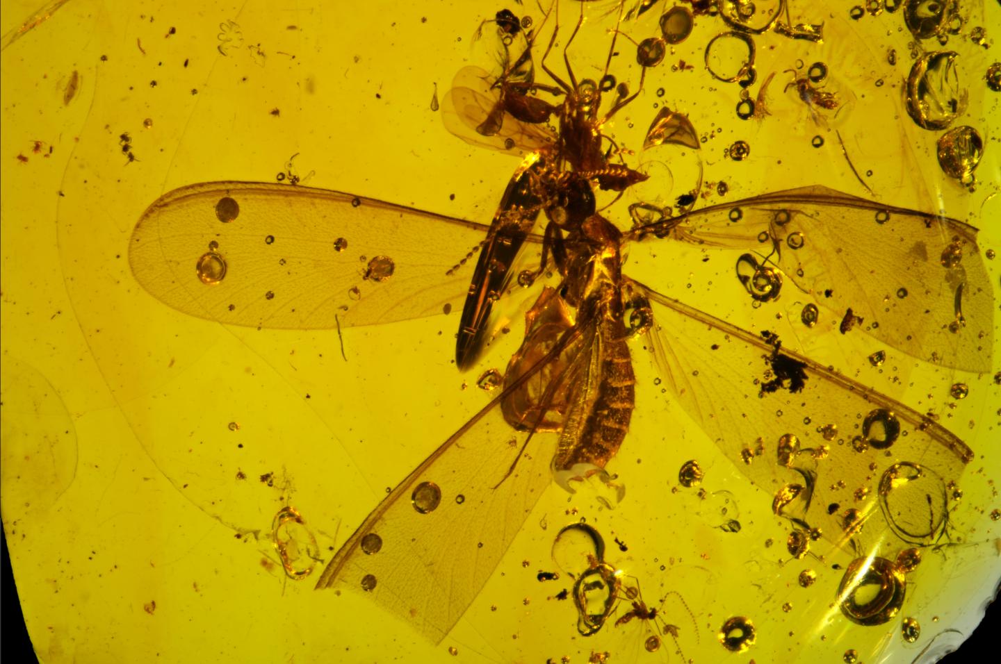 The fossil exhibits a number of springtails still attached to the wings and legs of their hosts, while others are preserved as if gradually floating away from their hosts within the amber. Researchers say the discovery highlights the existence of a new type of hitchhiking behavior among wingless soil-dwelling arthropods, and could be key to explaining how symphypleonan springtails successfully achieved dispersal worldwide.