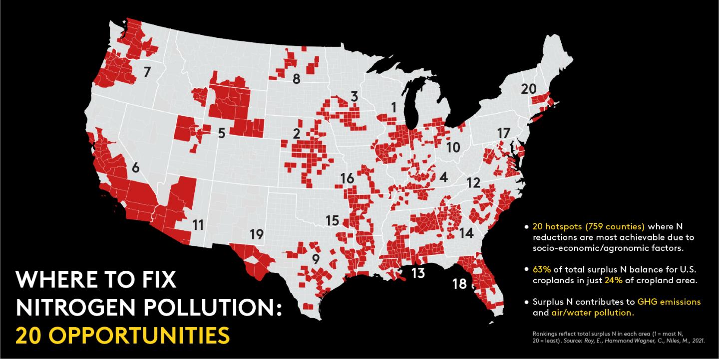 A pioneering study of U.S nitrogen use in agriculture has identified 20 places across the country where farmers, government, and citizens should target nitrogen reduction efforts.