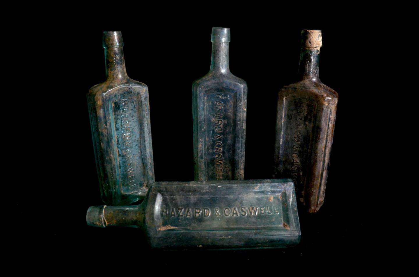 image: Hazard & Caswell bottles from an apothecary in Newport, R.I., that contained a medicinal concoction marketed as a cure for digestive and other ailments.