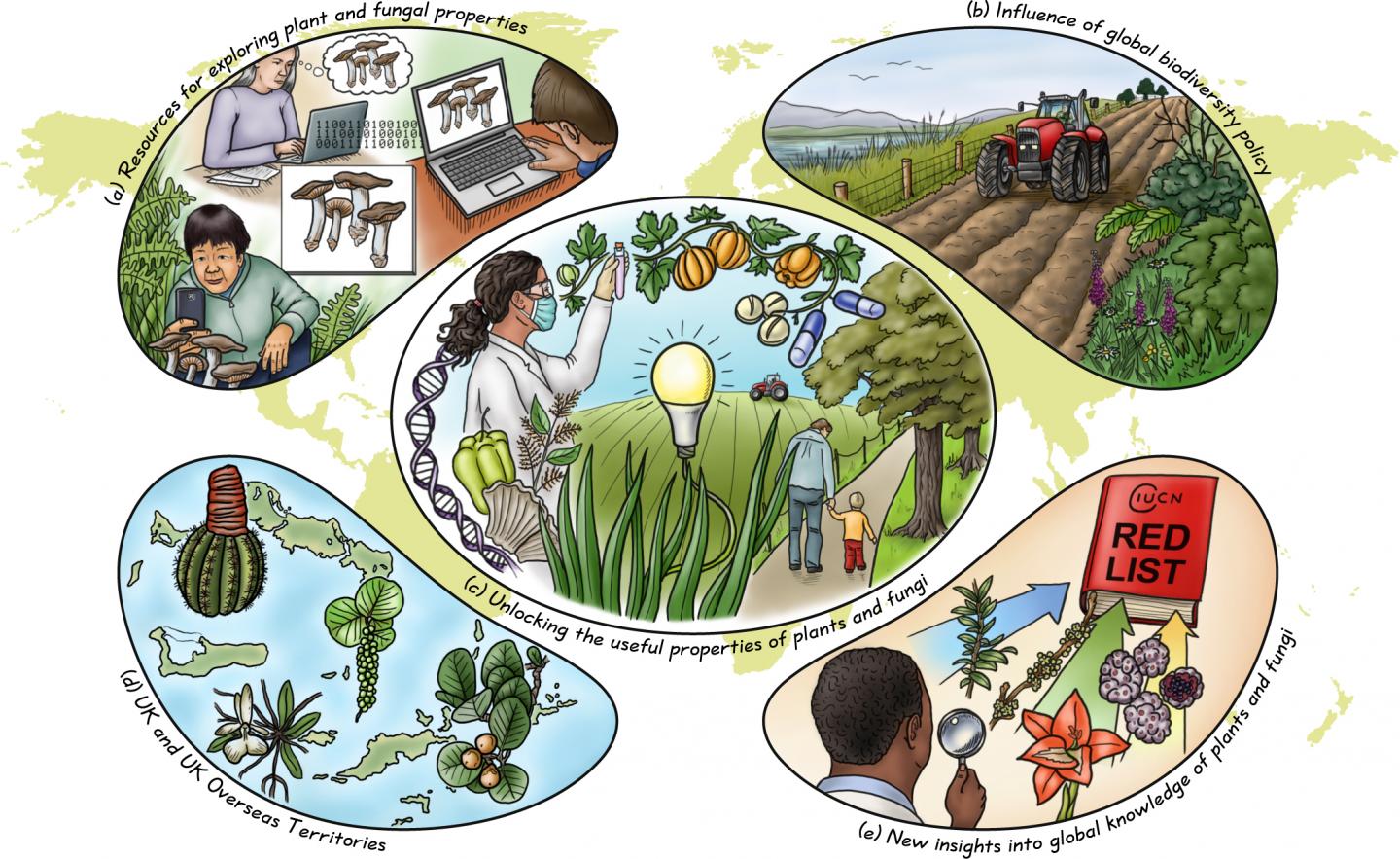 image: Five broad themes that encompass the State of the World's Plants and Fungi report 2020 are featured in this stylised illustration. (a) Resources for exploring plant and fungal properties; (b) The influence of global biodiversity policy; (c) Unlocking the useful properties of plants and fungi; (d) UK and UK Overseas Territories; (e) New insights into global knowledge of plants and fungi.