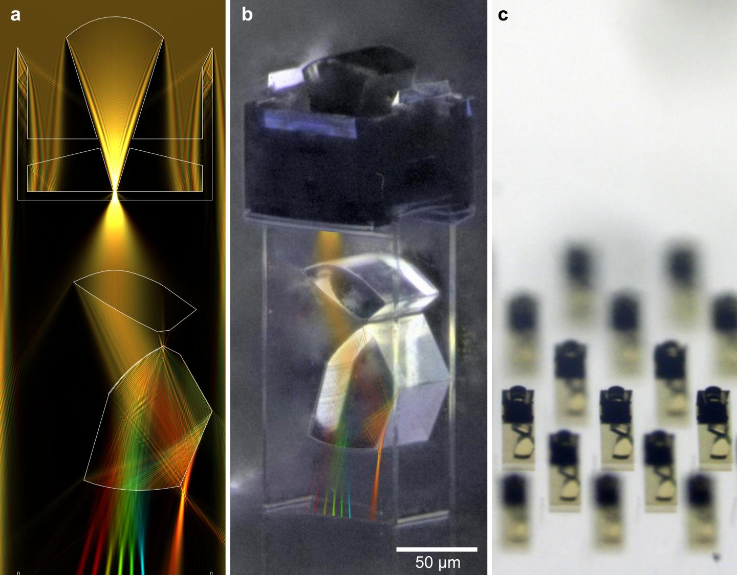 image: 3D-printed miniature spectrometer. a, wave-optical simulation of the spectrometer. b, microscope image of the fabricated spectrometer overlayed with the intensity distribution from a. c, array of fabricated spectrometers.