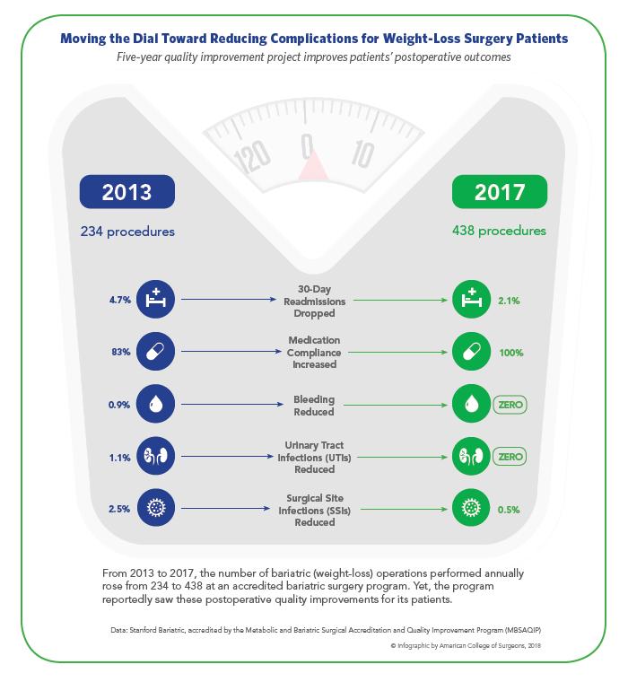 image: From 2013 to 2017, the number of bariatric (weight-loss) operations performed annually rose from 234 to 438 at an accredited bariatric surgery program. Yet, the program reportedly saw these postoperative quality improvements for its patients.