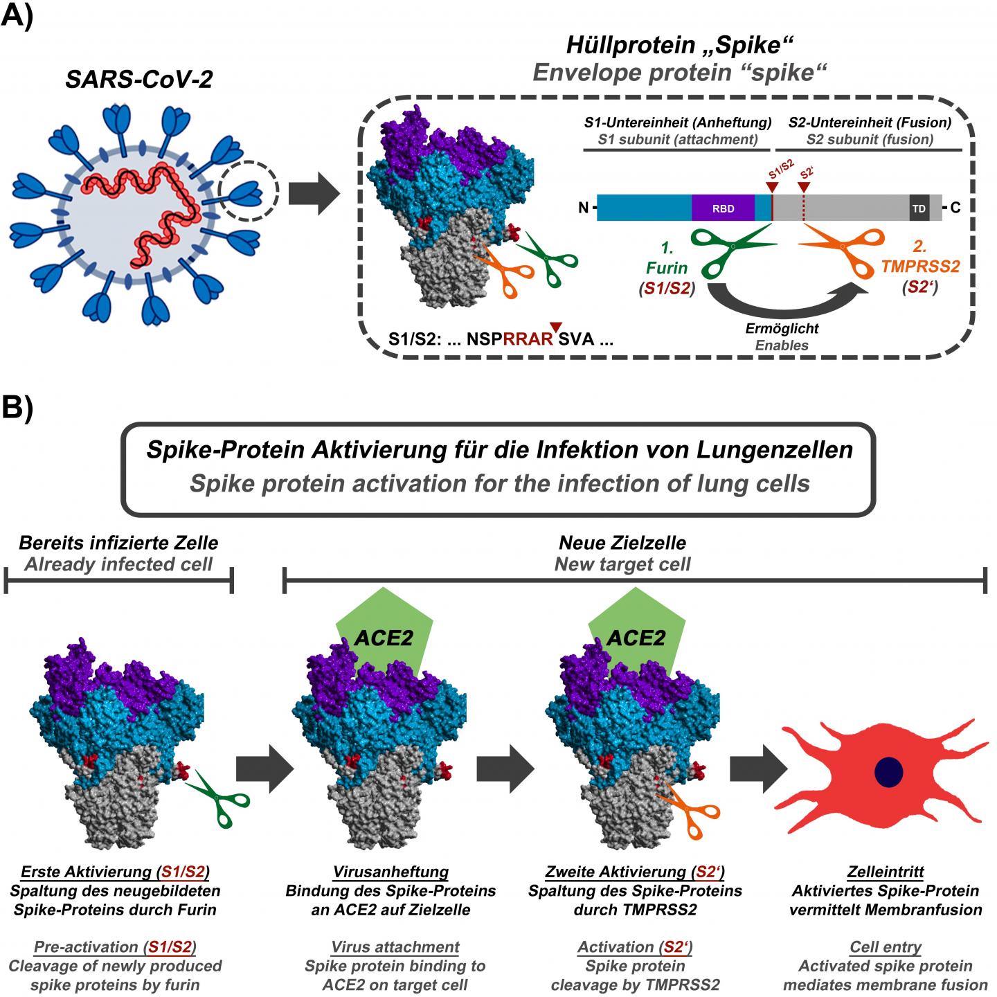 image: (A) Schematic representation of SARS-CoV-2, the viral spike protein and the cleavage sites for furin (green, S1/S2 position; the cleavage sequence is shown below the protein structure) and TMPRSS2 (orange, S2' position). (B) First, in already infected cells, the enzyme furin cuts the spike protein at the S1/S2 site. The spike protein then mediates viral attachment to a new host cell. In order to efficiently enter the cell, the spike protein still needs to be activated by the enzyme TMPRSS2. Activation by TMPRSS2 is only possible if the spike protein has previously been cleaved by furin.