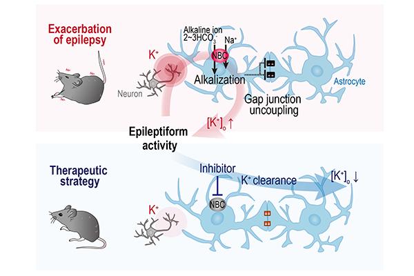 In response to hyperactivity of the surrounding neurons, Na+/HCO3- co-transporter (NBC) in astrocytes was activated. The resulting intracellular alkalization led to gap junction uncoupling and impairment of prompt potassium clearance. Pharmacological blockade of the NBC suppressed the plastic change of the astrocyte network and prevented intensification of epileptiform activity.