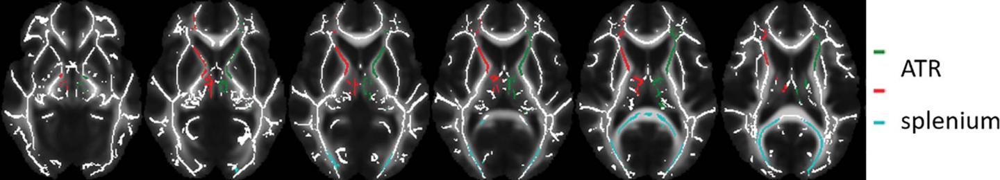 image: Images of regions of interest (colored lines) in the white matter skeleton representation. Data from left and right anterior thalamic radiation (ATR) were averaged.