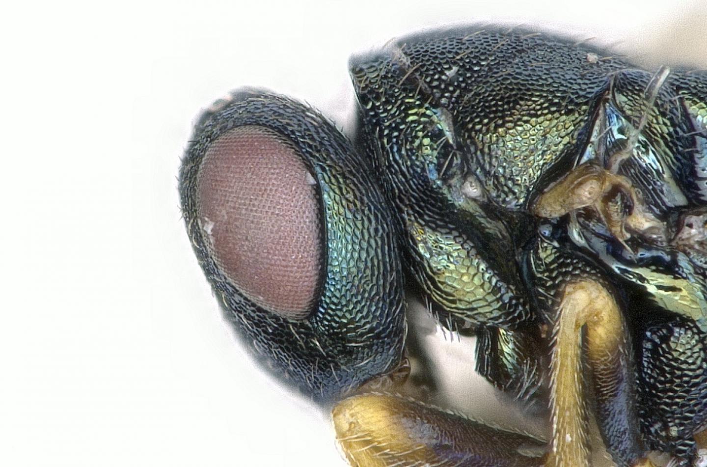 image: This is a lateral view of the head of the newly described parasitic wasp species Pteromalus capito.