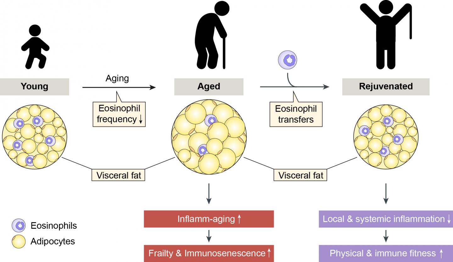 image: With age the frequency of adipose tissue eosinophils decreases gradually. This leads to the production of inflammatory mediators, which promote age-related impairments (e.g. frailty and immunosenescence). Eosinophil cell transfers increase the frequency of these cells in adipose tissue and dampen age-related chronic low-grade inflammation. This results in systemic rejuvenation of the aged organism.