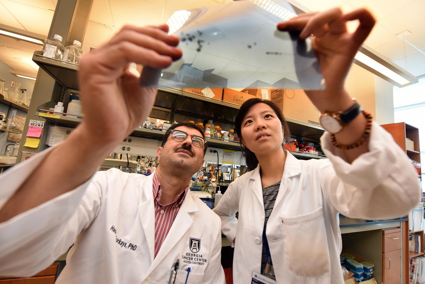 image: Dr. Hasan Korkaya, tumor biologist at the Georgia Cancer Center and Department of Biochemistry and Molecular Biology at the Medical College of Georgia at Augusta University and PhD graduate student, Eunmi Lee in Korkaya's lab.
