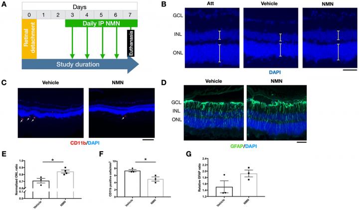 NMN administration after RD resulted in a significant reduction of TUNEL photoreceptors, CD11b macrophages, and GFAP labeled glial activation; a normalization of protein carbonyl content, and a preservation of the outer nuclear layer thickness.