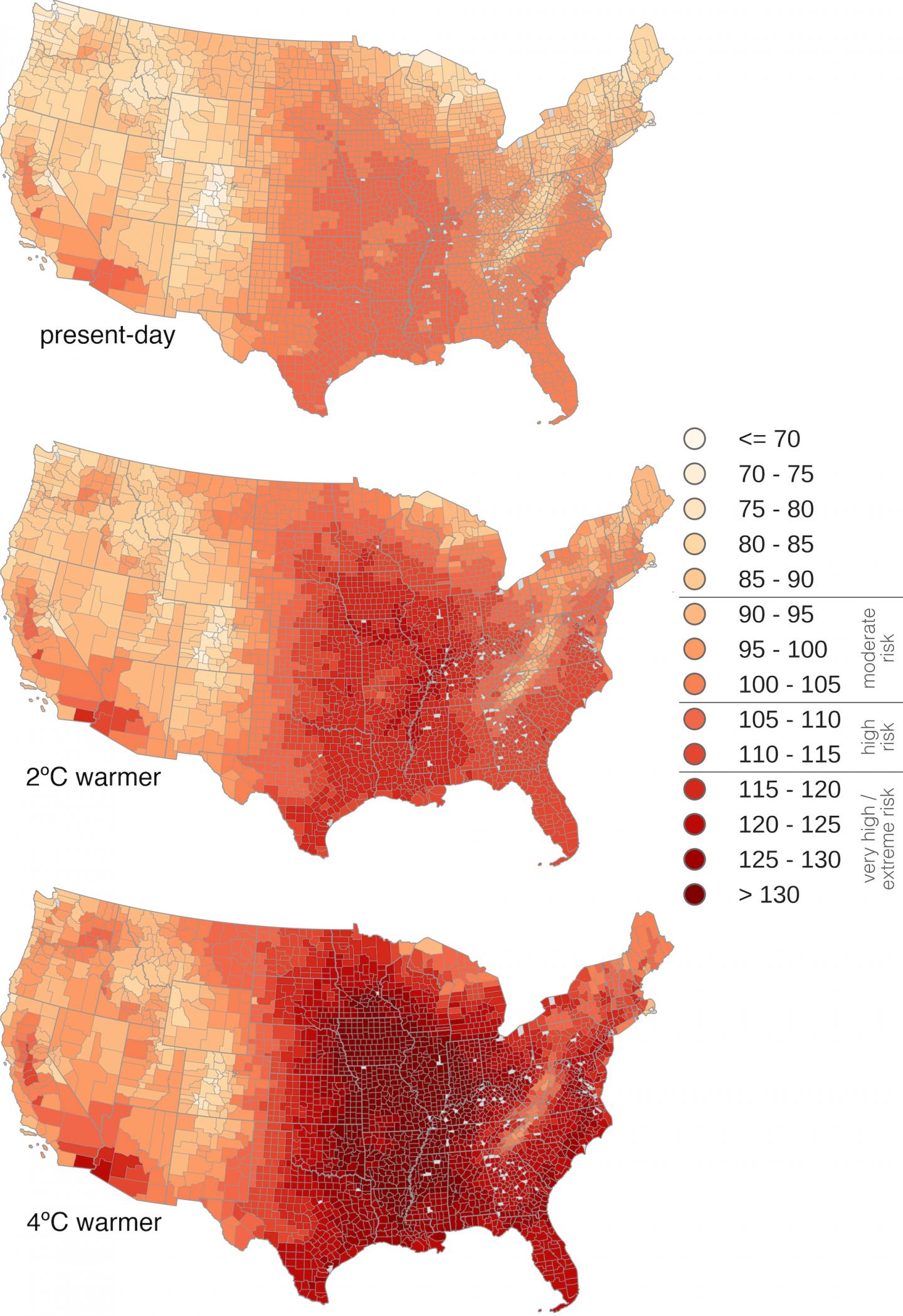 The study also shows that heat waves, prolonged stretches of three or more of the hottest days for each county, will occur five times as often, on average, under 2 degrees Celsius of warming.