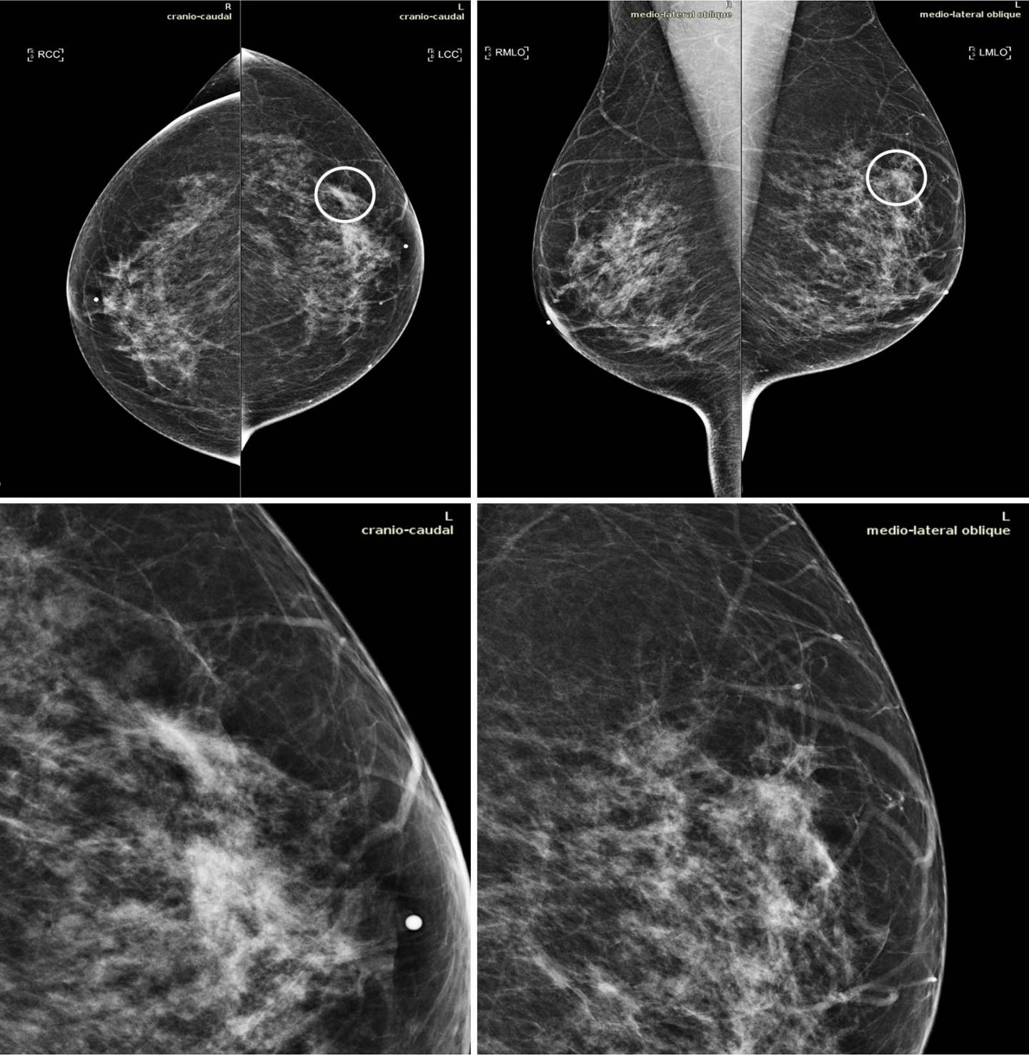 image: Mammograms in a 51-year-old woman with invasive ductal carcinoma. The upper panels show the craniocaudal and the mediolateral oblique views. The lower panels show a close-up of the left breast area containing the lesion. The case is one of the false-negative cases included in the dataset. Accordingly, the initial screening assessment was a BI-RADS 2, meaning visible findings were judged as benign. After 1 year, the patient presented for another screening examination. This time, a focal asymmetry with associated distortion within the left breast was noticed; the patient was recalled and diagnosed with a 1.5-cm mass in the upper outer quadrant of the left breast on the craniocaudal view (circle).