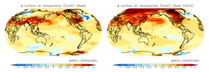 image: Simulations using MIROC-SPRINTARS predict annual mean distribution of changes in surface air temperature following reduction of SO2 emissions from fuel sources to 10% of the current level under present (left) and doubled (right) CO2 concentrations. Decreasing sulfate aerosols from human activity at high CO2 concentrations results in enhanced temperature increases, especially in the mid-to-high latitudes of the Northern Hemisphere.