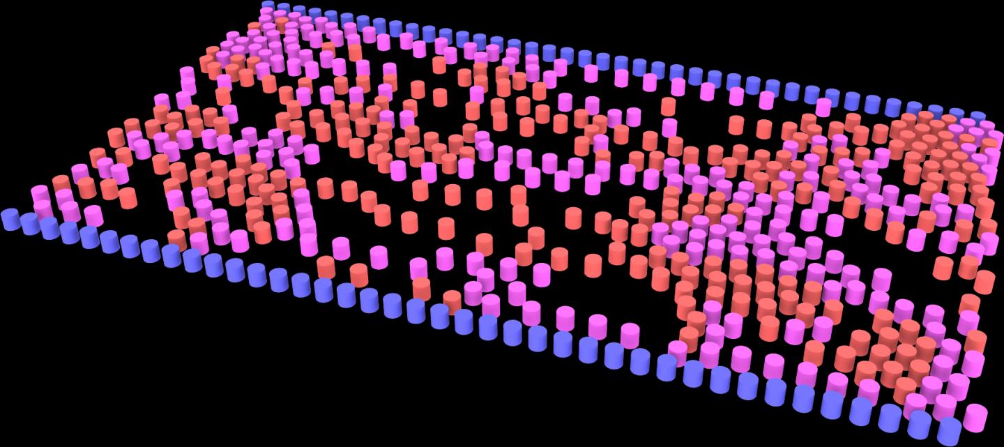 image: Simulation of pedestrian counterflow (red and pink particles) confined within a hallway (blue boundary), under conditions of weak social distancing.