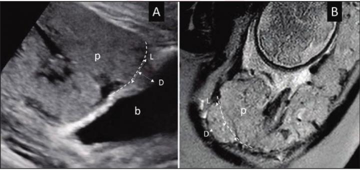 image: (A) Ultrasound in 28-year-old woman (B) MRI in 34-year-old woman with suspected PAS disorder. Focal area of placental tissues bulge toward imaginary lines of normal uterine contour (dash lines). Length (L) and depth (D) measurements of placental bulge also demonstrated. p = placenta; b = bladder.