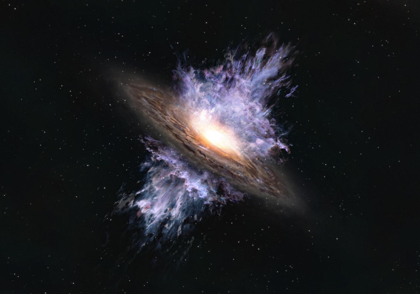 image: Artist's impression of a galactic wind driven by a supermassive black hole located in the center of a galaxy. The intense energy emanating from the black hole creates a galaxy-scale flow of gas that blows away the interstellar matter that is the material for forming stars.