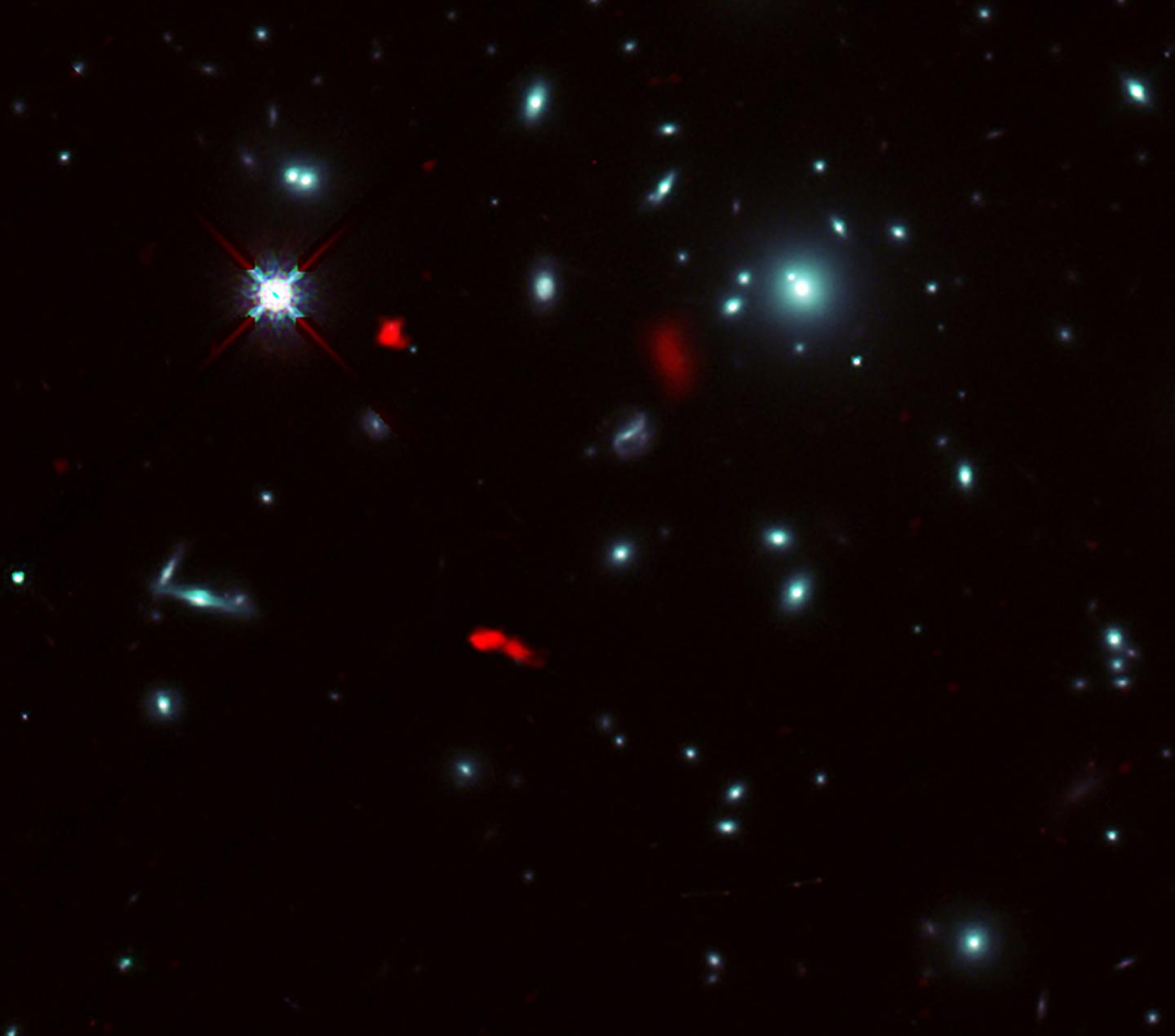 image: Image of the galaxy cluster RXCJ0600-2007 taken by the NASA/ESA Hubble Space Telescope, combined with gravitational lensing images of the distant galaxy RXCJ0600-z6, 12.4 billion light-years away, observed by ALMA (shown in red). Due to the gravitational lensing effect by the galaxy cluster, the image of RXCJ0600-z6 was intensified and magnified, and appeared to be divided into three or more parts.