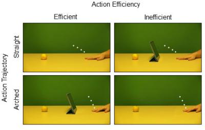 In some screenings of the actions, an obstruction was put in between the hand and the object it was reaching for (see image 1). The arched trajectory was therefore expected to avoid the obstruction, whereas the straight trajectory was 'inefficient' as it would knock into it. Where there was no obstruction, the straight action was free to reach directly for the target, whereas the arched trajectory was unnecessary and unexpected.
