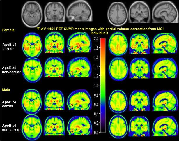 "Sex plays an important role in Alzheimer's disease risk, with females having a higher lifetime risk of developing the disease and an increased vulnerability to genetic risk factors," points out Yun Zhou, who led the project at the Mallinckrodt Institute of Radiology, Washington University in St. Louis School of Medicine. He explains, "This is the first study to demonstrate that sex modulates the effect of ApoE ε4 on brain tau depositing, measured using 18F-AV-1451-PET imaging, in the entorhinal cortex, amygdala, parahippocampal gyrus, and posterior cingulate of the brains of patients with mild cognitive impairment (MCI). Strikingly, females experience greater ApoE ε4-associated increases in brain tau deposition in these regions compared to their male counterparts."