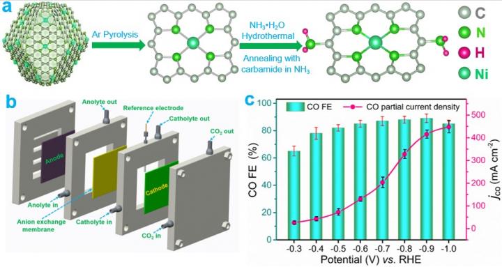 The aminated Ni single-atom catalyst demonstrated a remarkable current density of >400 mA cm-2 with a nearly 90% Faraday efficiency for CO production, which is 1.8 times of that before amination.