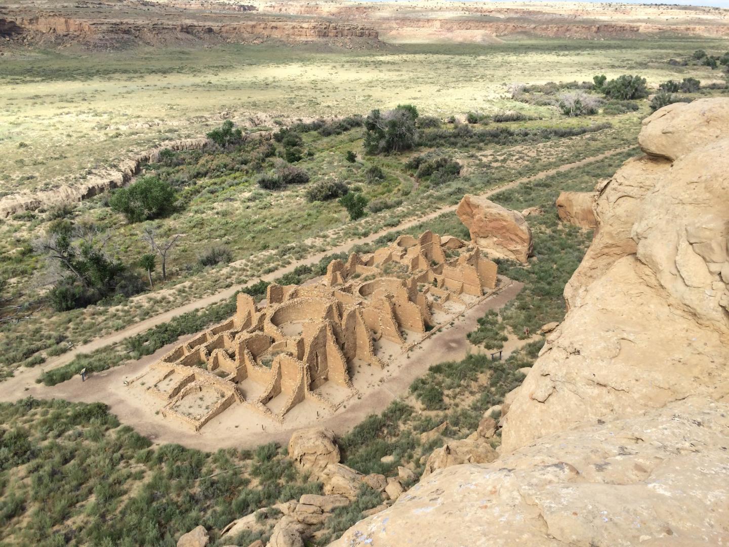 image: This is a view from a mesa of a Chaco Canyon great house called Kin Kletso.