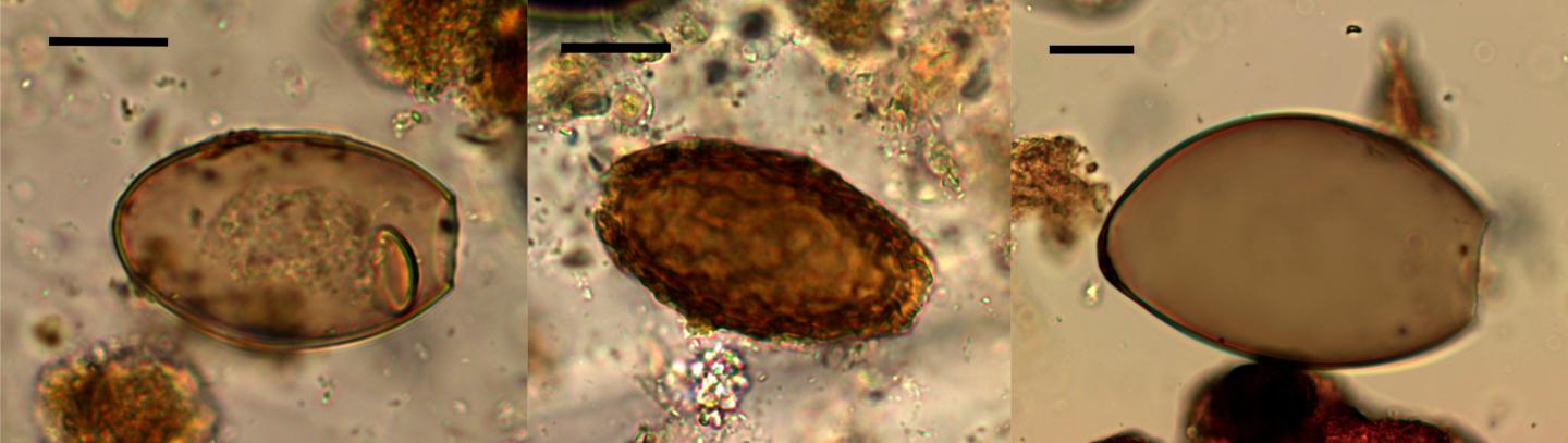 image: Microscopic eggs of fish tapeworm (left), giant kidney worm (centre), and Echinostoma worm (right) from the Must Farm excavation. Black scale bar represents 20 micrometres.