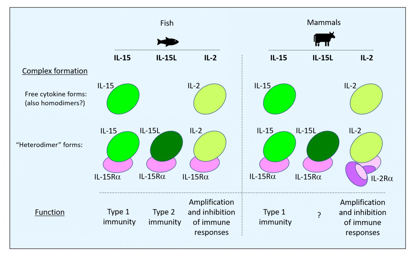The cytokine family including interleukin-2 and -15 (IL-2 and IL-15) started out in a primitive vertebrate species with three related cytokines IL-2, IL-15, and IL-15-like (IL-15L), all sharing binding capacity for receptor chain IL-15Rα. IL-15L was conserved in fishes, reptiles, and some mammals but lost in human and mouse. Researchers in Japan, Germany, and the UK, have now determined the function of IL-15L using rainbow trout. Data suggest that in the jawed vertebrate ancestor IL-15 and IL-15L, forming "heterodimer cytokine" complexes with IL-15Rα, selectively induced type 1 (aka Th1) and type 2 (aka Th2) immunity, respectively, whereas free IL-2 efficiently stimulated activated and regulatory T cells by binding their surface IL-15Rα. Insights into their evolution should inspire further studies of human IL-2 and IL-15, both of which are used or tested in cancer immunotherapy.