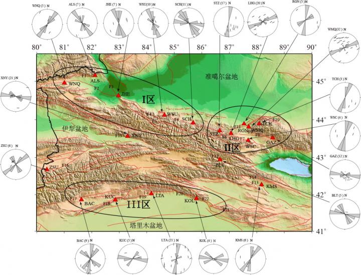 image: Distribution of fast-wave polarization directions in the middle part of the Tianshan Mountains.