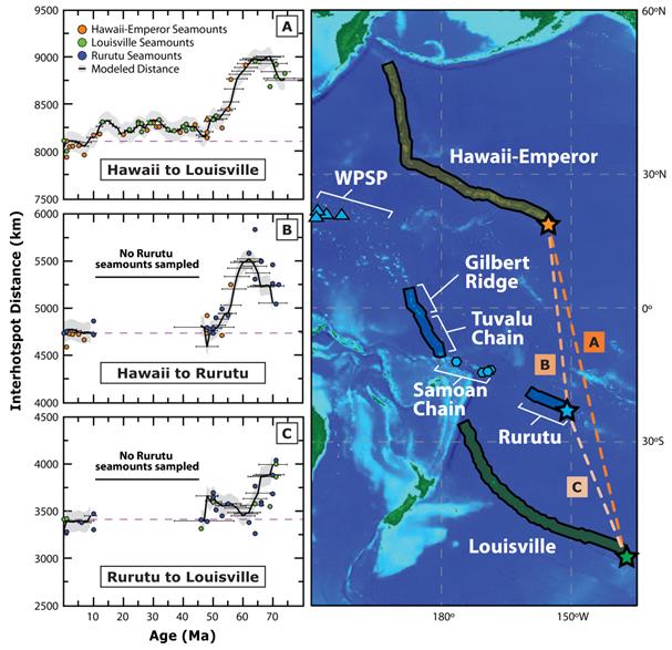 image: The graph shows the dates of volcanoes of the three volcanic chains in the Pacific and their relative movement over time (left). The location of the three volcanic chains shown in the map (right). The stars mark the youngest end or the active volcanoes today.