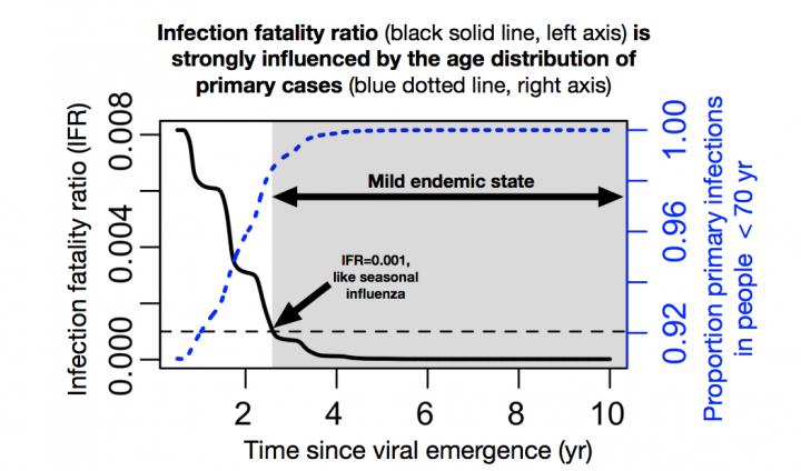 The model predicts that the infection fatality ratio for SARS-CoV-2 may fall below that of seasonal influenza (0.1 percent), once an endemic steady-state is reached.