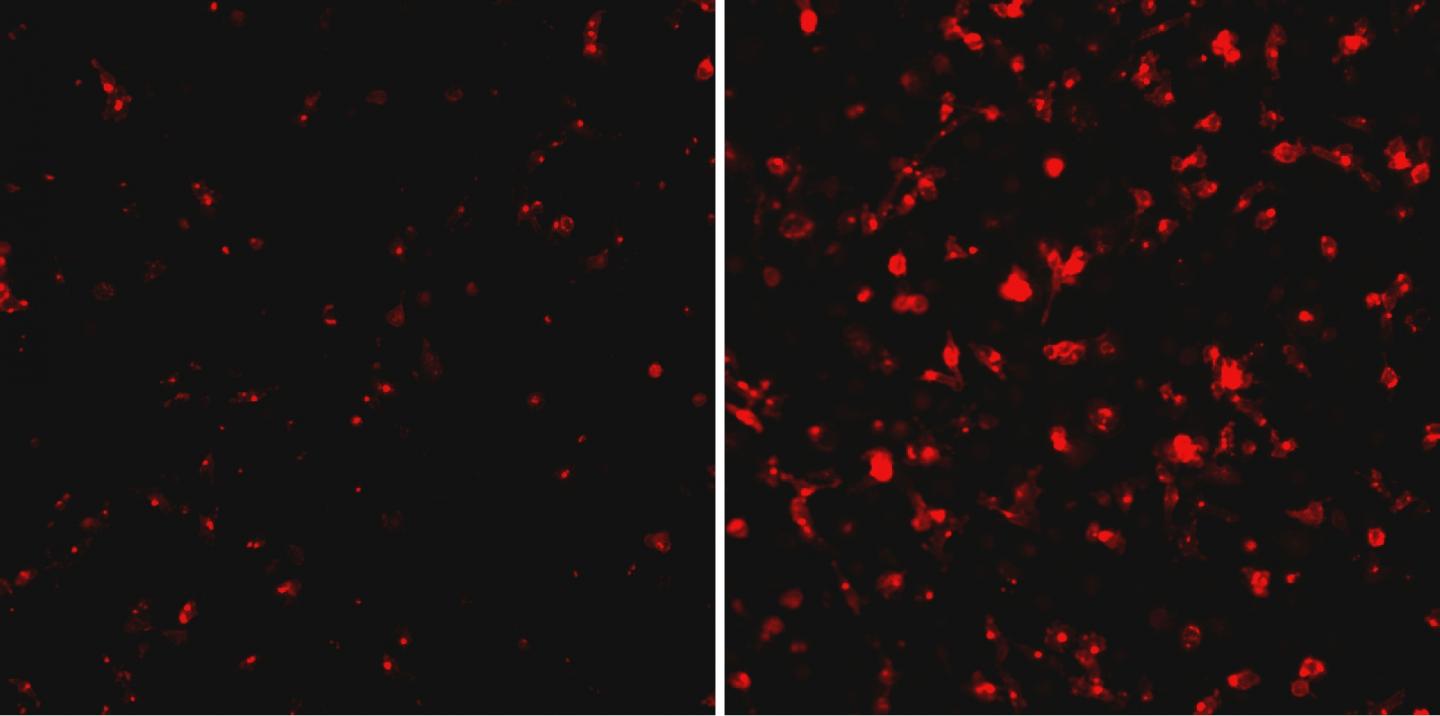 image: Ebola virus (red) replicates much faster in human macrophages depleted of RBBP6 protein (right panel).