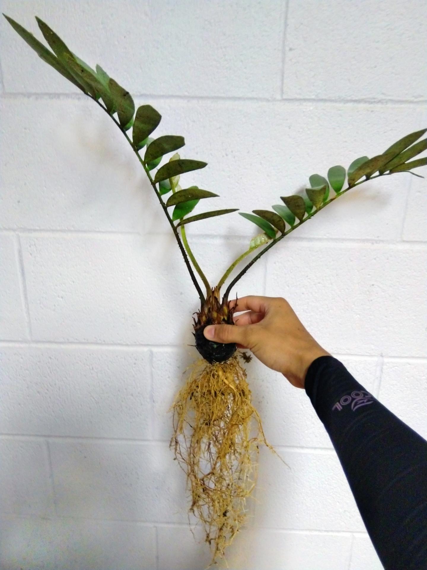 image: Benjamin Deloso holds a Zamia stem cutting that has successfully produced a healthy root system. In his recently published research, he found the use of anti-transpirants to neither help nor hinder successful propagation of cycads.