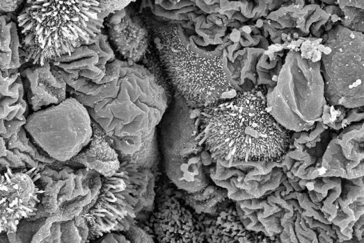 image: Scanning electron micrograph of epithelial cells lining the inside of the lung. Different cell types with different shapes and different functions compose this inner lining, and the right balance between these cell types is important for a healthy lung.