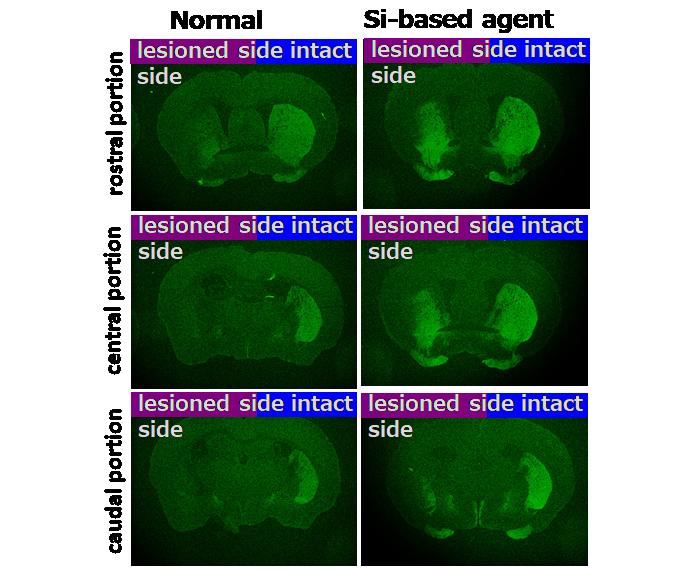 image: Neuroprotective effects of Si-based agent. The left panel shows histologic slices of animals from the normal feed group and the right panel shows histologic slices of animals fed with S-based agent, demonstrating the attenuation of lesions caused by 6-OHDA to mimic Parkinson's disease.