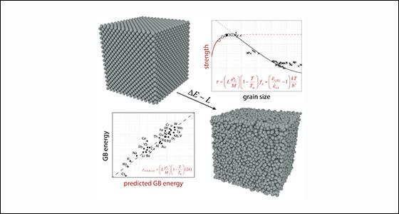 image: The image shows the transformation of a crystalline metal (upper left) to amorphous material (lower right), with an energy difference related to the heat of fusion. The graph in the upper right shows a representative plot of strength vs. crystallite (grain) size and includes the predictions from the model (red line) compared to experimental (x) and simulation (o) data. The graph in the lower left shows the model predictions for grain boundary energies of a variety of metals compared to density functional theory calculations from the literature.