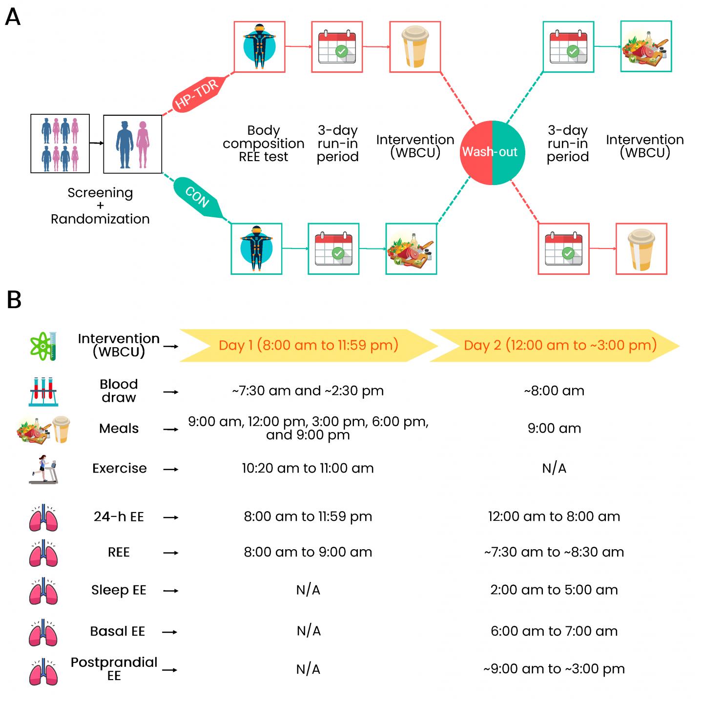 image: Overview of the experimental protocol (A) and variables assessed during each 32-h test (B). CON, control diet; EE, energy expenditure; HP-TDR, high-protein total diet replacement; N/A, not applicable; REE, resting energy expenditure; WBCU, whole-body calorimetry unit.