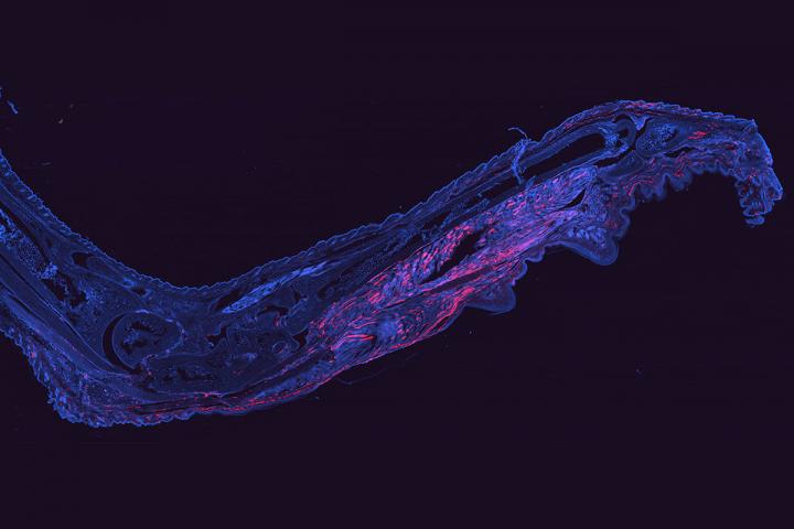 image: Cells harboring chikungunya virus (red) are visible in a mouse foot 28 days after infection. The virus is notorious for causing prolonged, painful arthritis that can last for years. Researchers at Washington University School of Medicine in St. Louis have developed a way to fluorescently tag cells infected with chikungunya virus. The technique opens up new avenues to study how the virus persists in the body and potentially could lead to a treatment.