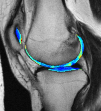 image: The cartilage in this MRI scan of a knee is colorized to show greater contrast between shades of gray.