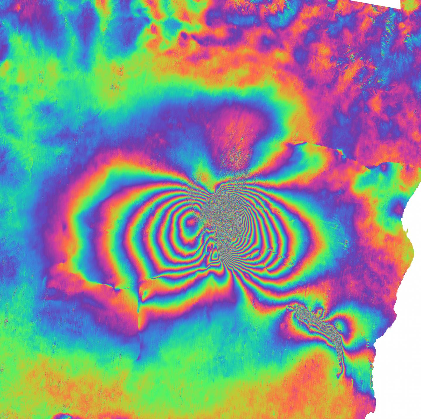 image: This is an interferogram of the December 2018 eruption of Etna in southern Italy, based on Sentinel-1 satellite images. Interferograms spatially map ground surface movements.