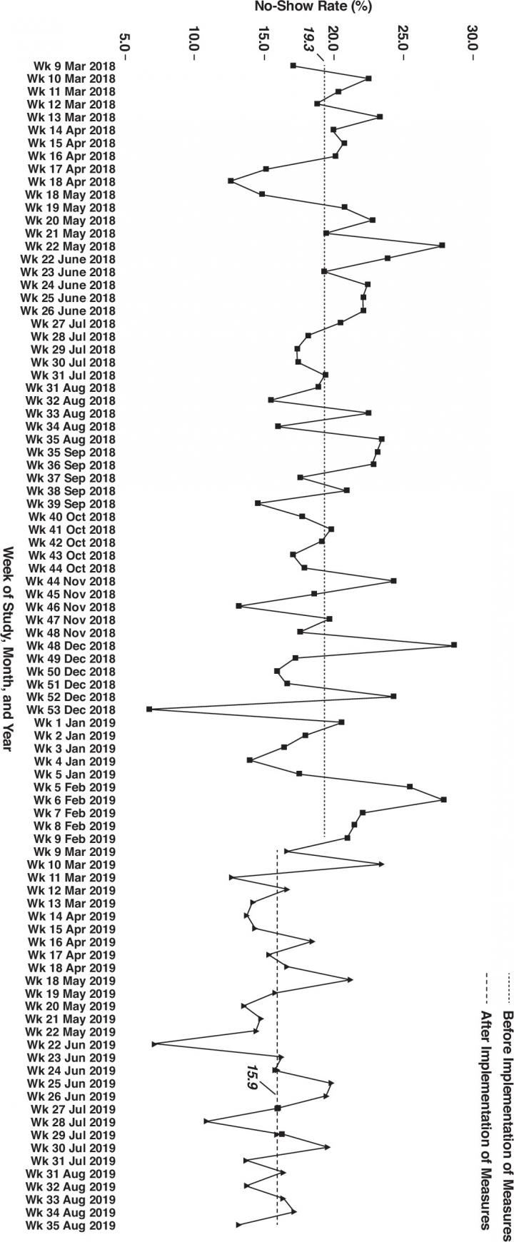 image: Weekly outpatient MRI appointment no-show rates for 1 year before (19.3%) and 6 months after (15.9%) implementation of intervention measures in March 2019, as guided by XGBoost prediction model. Squares denote data points.