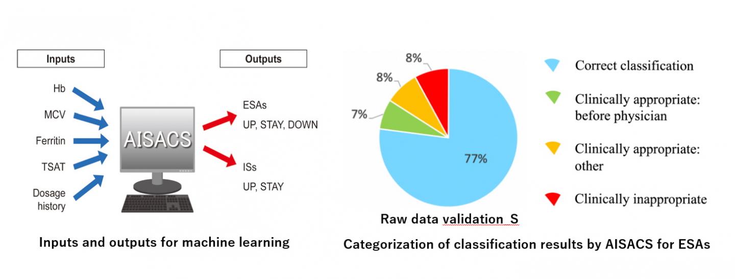 Based on these, they constructed an AI-based model called an "artificial-intelligence-supported anemia control system" (AISACS), which received a total of five inputs (four items of blood examination and dosage history) and churned out dosage direction probabilities for the two medications as outputs. In addition, to make the training process more efficient, they compensated for the time lag between blood examination and dosage decisions by using "data rectification" to match the decision dates with the examination dates.