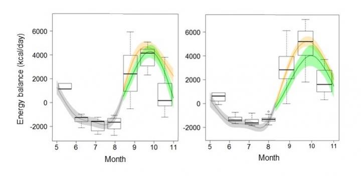 "We have been directly watching bears feeding over 10 years. And we measured ingestion rates of the major food items; acorns on the tree had the highest ingestion rate, while the values of other items did not show notable characteristics," said Koike. "We obsterved that the variability of energy expenditure rose moderately in good mast years, except for males. On the other hand, there was a twin-peak pattern of energy intake and energy balance, declining from May to July, rising again from August to October, and declining in November."