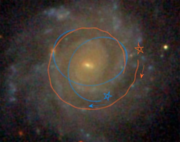 image: This illustration shows how two sample star orbits are scattered from nearly circular orbits by the gravity of massive clumps within galaxies. Researchers have found that millions of orbital changes, like those shown here, smooth the overall light profile of galaxy disks. The blue star is scattered several times. The orange star is captured by the gravity of a clump and moves around it. A typical, relatively smooth spiral galaxy (UGC 12224) is shown in the background.