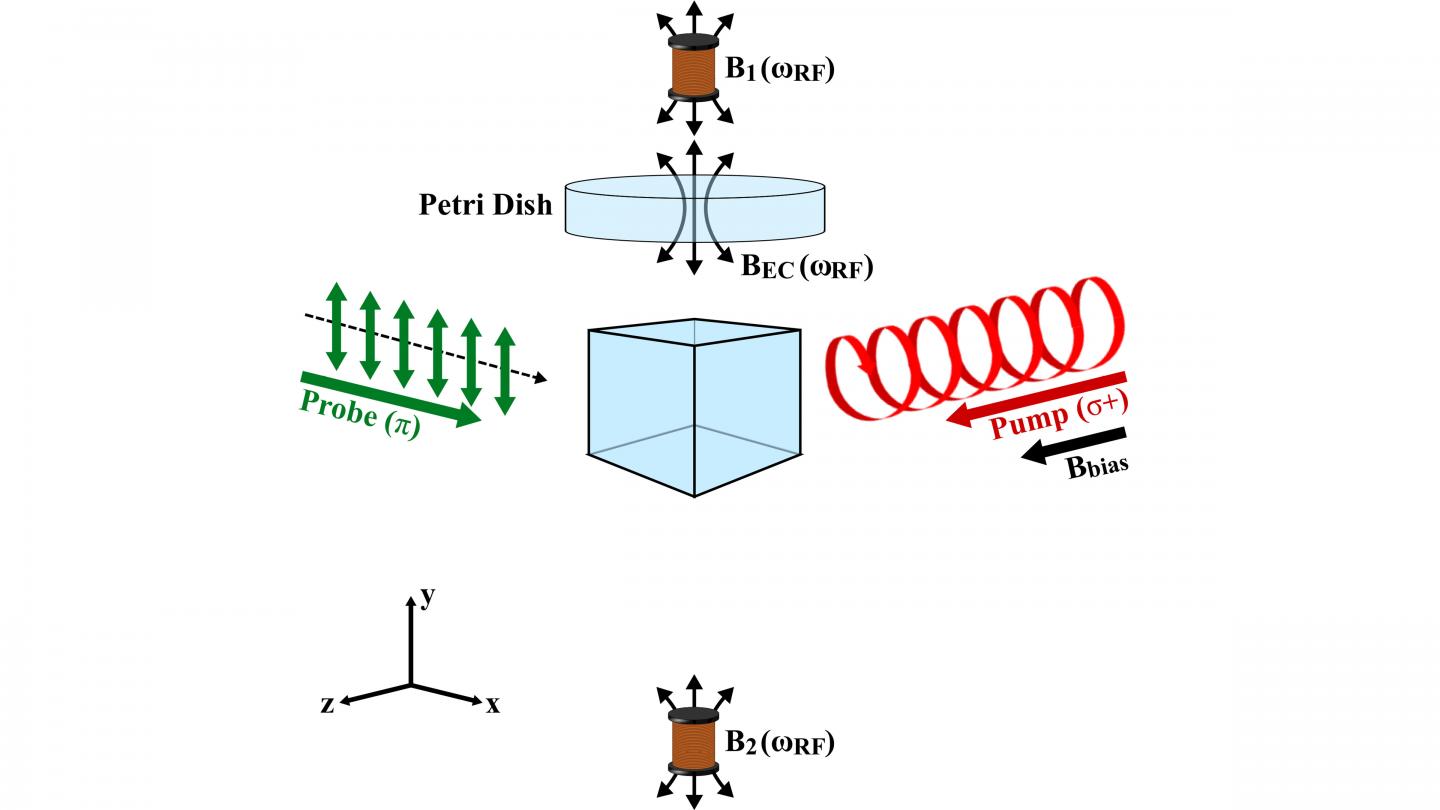image: A pair of coils induces a magnetic field response (labeled BEC) in a low-conductivity solution contained in a petri dish, detected by a radio-frequency atomic magnetometer, based on laser manipulation and interrogation of atomic spins contained in a cubic glass chamber.