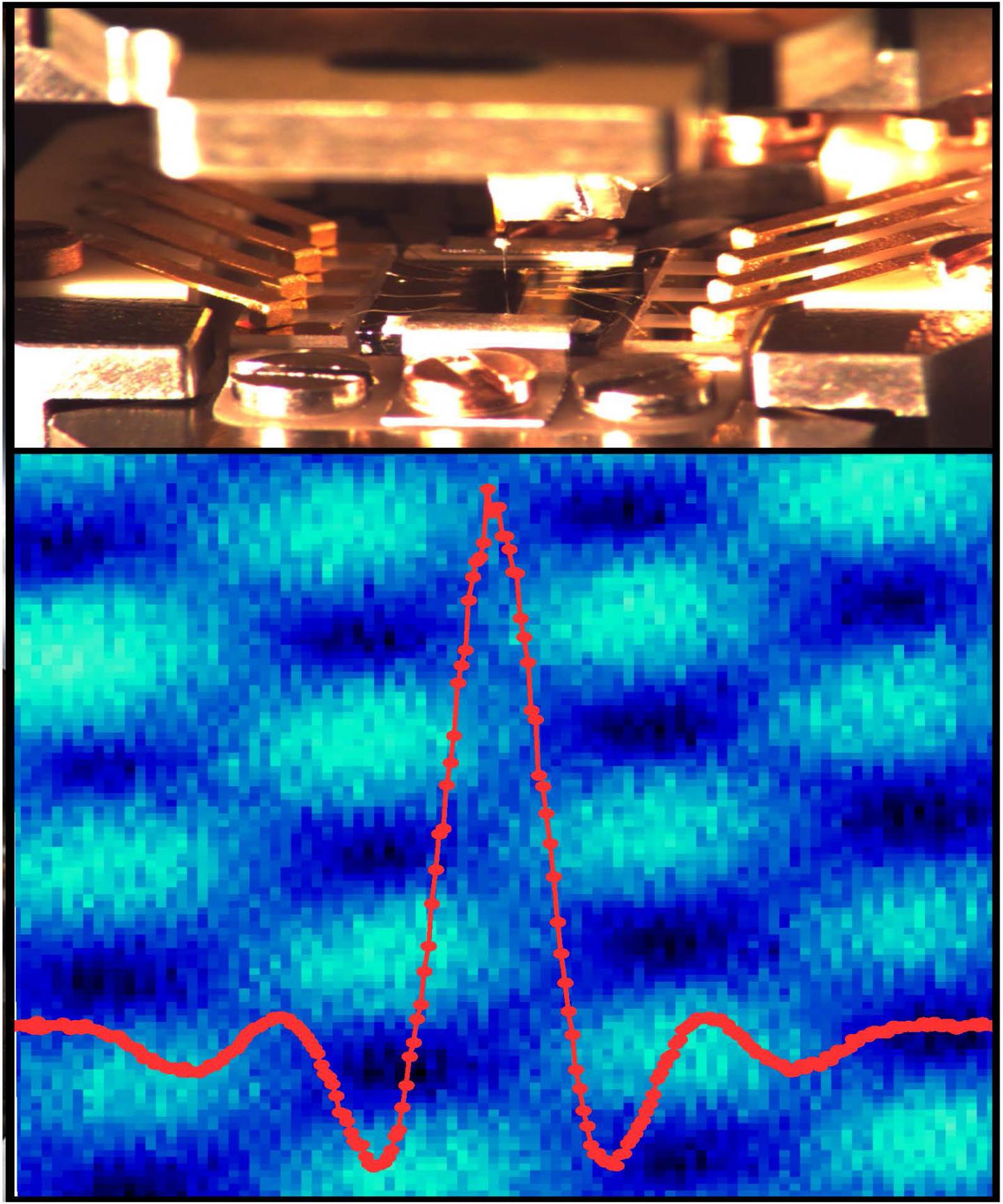 Bottom: Atomic force image of an aluminum sample showing the arrangement of atoms measured at 0.01 Kelvin (-459.65 degree Fahrenheit). The red curve shows the aluminum film is superconducting by having an electrical current with zero voltage.