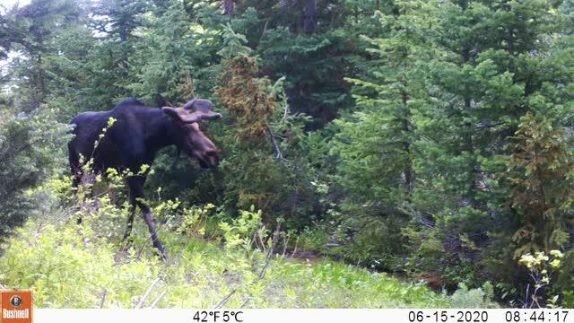 video: A moose saunters into view of an automatic motion-activated trail camera, placed to passively monitor wildlife activity.