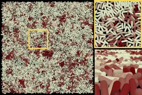 video: Computer simulation of bacterial competition. The fast bacteria (green) get stuck in rosettes-like structures, grinding to a halt, while the slow bacteria keep moving.