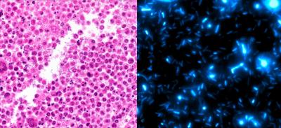image: Histology image of bacteria growing within necrotic regions of lymphoma tumors (LEFT). Bacteria are programmed to undergo waves of growth and self-destruction leading to immunotherapeutic release (RIGHT).