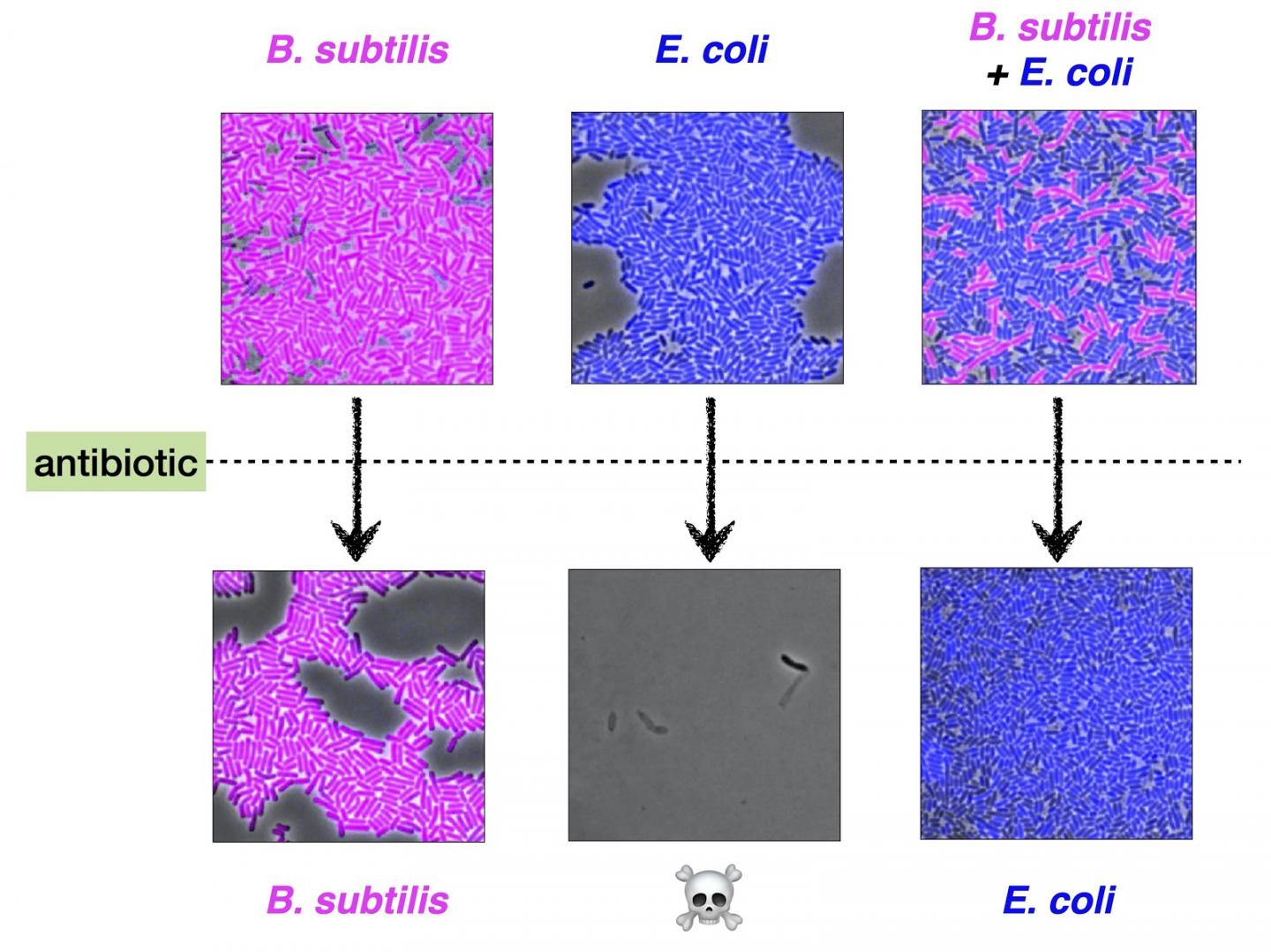 image: Counterintuitively, the researchers observed that when the two species of bacteria coexist, their response to the antibiotic is opposite to when they are alone.