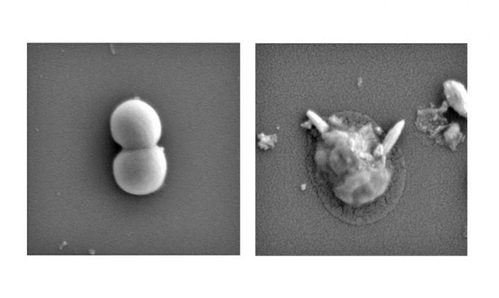 image: Golden Staph bacteria before (left) and after (right) exposure to the magnetic liquid metal nanoparticles. In the images, magnified 70,000 times, sharp pieces of liquid metal particle can be seen physically disrupting the bacteria after treatment.