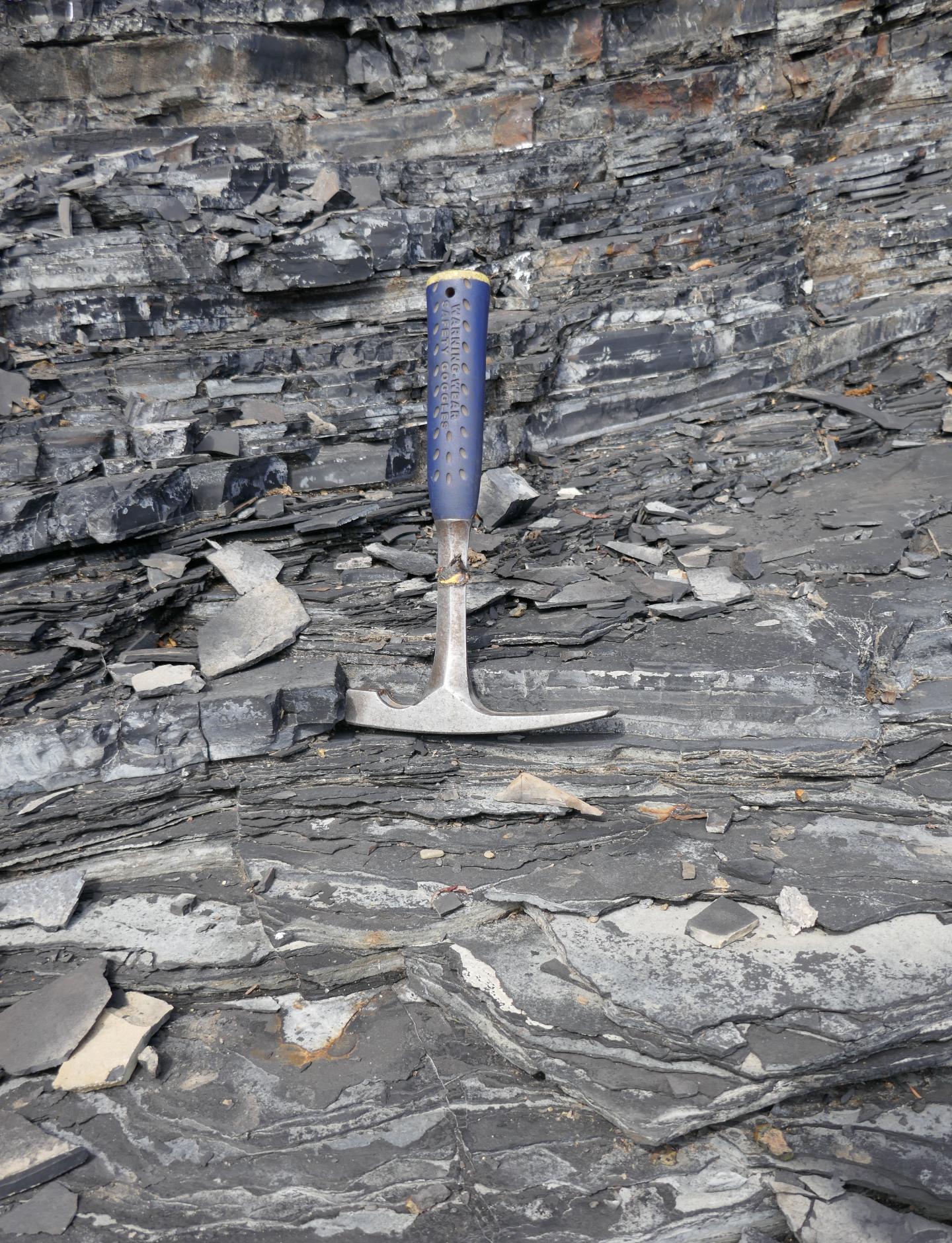 image: Laminated black shales and cherts exposed on the Peel River, Yukon, Canada, that were deposited during the late Ordovician and earliest Silurian. These sediments show no evidence of organisms living on the seafloor due to anoxic conditions at the seabed. Researchers estimated the global extent of low-oxygen conditions during this time period using new trace metal isotope data and uncertainty modeling.